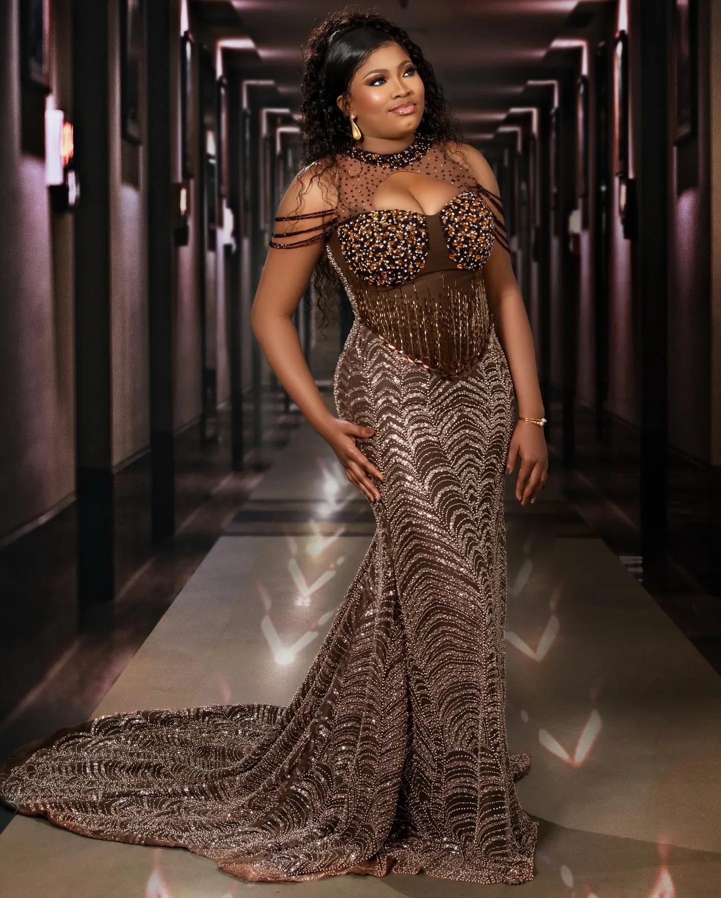 This brown prom dress is a fantastic option for those who want to achieve an unforgettable look without sacrificing comfort. The mermaid silhouette is both flattering and graceful, hugging your body beautifully and flaring out at the bottom. Its floor-length design and sweep train add a dramatic effect, making it a perfect choice for prom or other high-profile events. This dress is customizable to ensure a perfect fit, making it ideal for plus-sized individuals as well.
