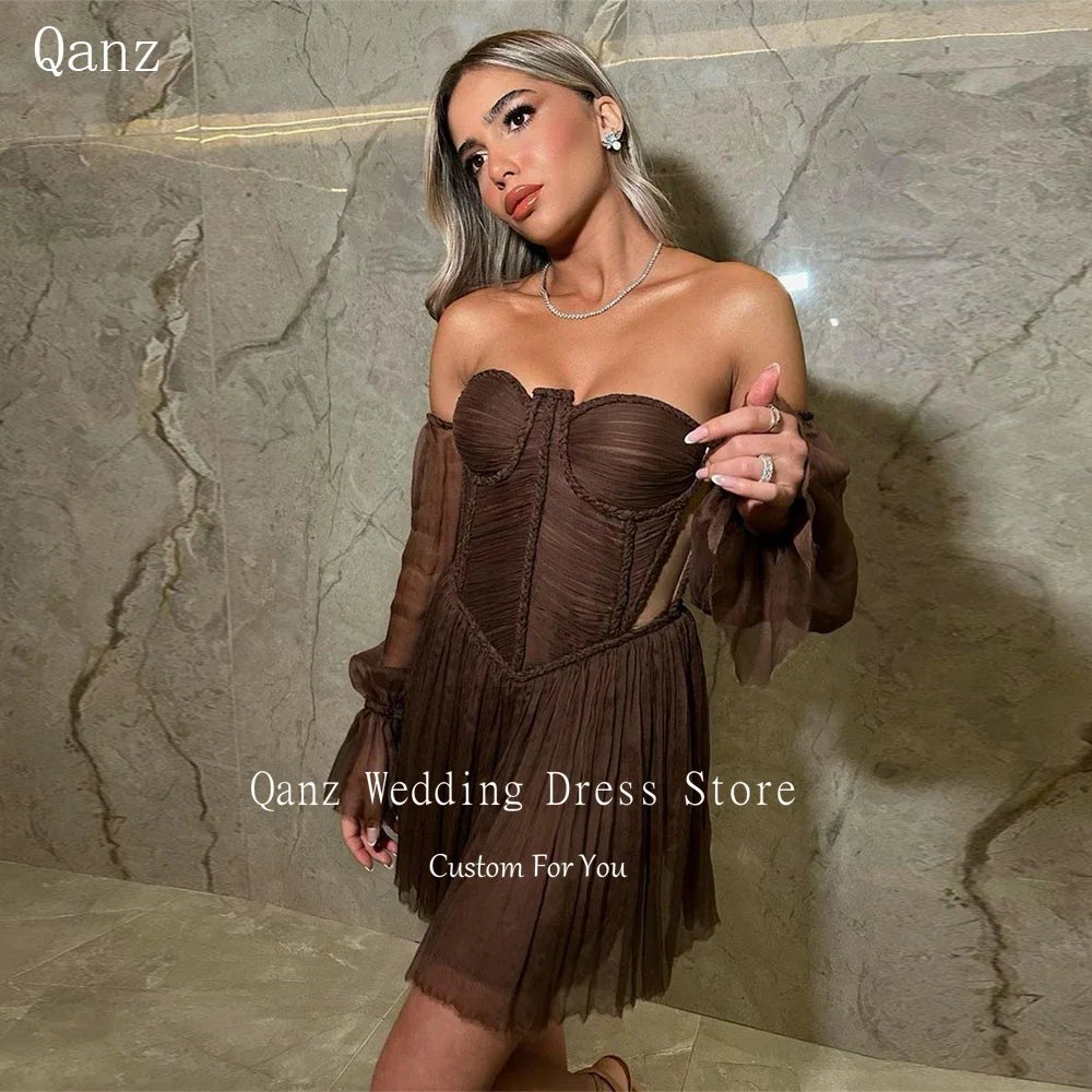 Qanz Brown Silk Chiffon Prom Dress With Puff Sleeves Corset Back