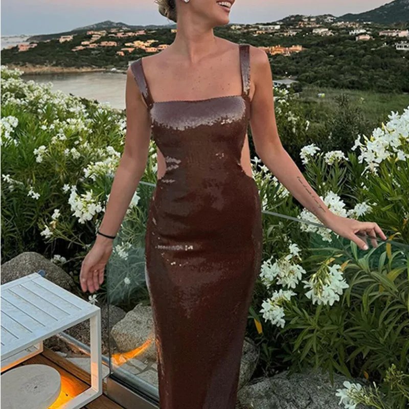 This brown prom dress features a sexy sequin design with a hollow-out detail and sleeveless cut, perfect for evening parties. Its sleek, form-fitting silhouette offers an elegant and dazzling look for any special occasion.